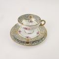 明治期に作られたオールドニッポン チクサ 田代製のティーカップ&ソーサートリオ。光が透けるような薄手の器にはベイビーブルーの縁取りに金彩、金点盛りが丁寧に施され、白い生地の上には濃いピンクと明るいピンクの薔薇が2輪ずつつながるように描かれたエレガントでやさしい雰囲気の作品。