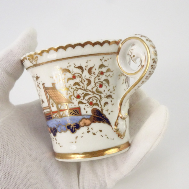 カップの口縁や、皿の縁全体には波打つ形状が施され、持ち手も珍しいデザインのシノワズリのカップ&ソーサー。コバルトブルー、金彩、ピンク、朱色など色合いも華やかで楽しい雰囲気のカップ&ソーサーです。